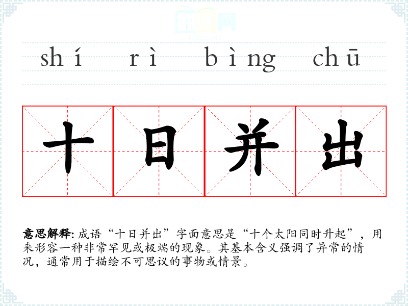 成语“十日并出”字面意思是“十个太阳同时升起”,用来形容一种非常罕见或极端的现象。其基本含义强调了异常的情况,通常用于描绘不可思议的事物或情景。