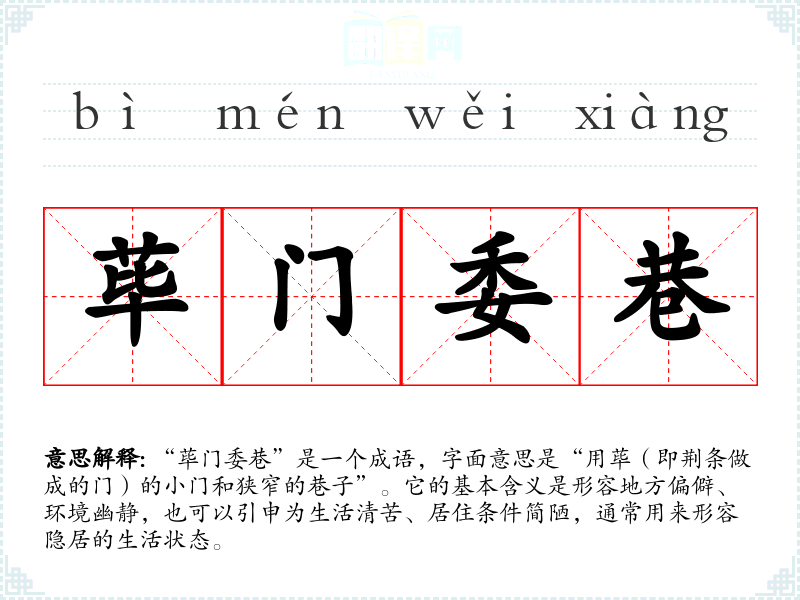 “荜门委巷”是一个成语,字面意思是“用荜(即荆条做成的门)的小门和狭窄的巷子”。它的基本含义是形容地方偏僻、环境幽静,也可以引申为生活清苦、居住条件简陋,通常用来形容隐居的生活状态。