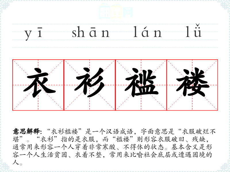 “衣衫褴褛”是一个汉语成语,字面意思是“衣服破烂不堪”。“衣衫”指的是衣服,而“褴褛”则形容衣服破旧、残缺,通常用来形容一个人穿着非常寒酸、不得体的状态。基本含义是形容一个人生活贫困、衣着不整,常用来比喻社会底层或遭遇困境的人。