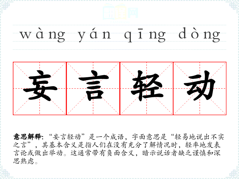 “妄言轻动”常用于文学作品中,尤其是在描写人物性格时,强调其轻率和不负责任的态度。在日常对话中,也常用于批评那些在未经思考的情况下就发表看法或采取行动的人,特别在讨论社会热点或敏感**时尤为常见。在演讲中,演讲者可以用这个成语来提醒听众要谨慎发言,避免传播不实信息。