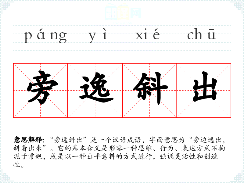 “旁逸斜出”是一个汉语成语,字面意思为“旁边逸出,斜着出来”。它的基本含义是形容一种思维、行为、表达方式不拘泥于常规,或是以一种出乎意料的方式进行,强调灵活性和创造性。