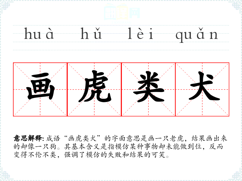 成语“画虎类犬”的字面意思是画一只**,结果画出来的却像一只狗。其基本含义是指模仿某种事物却未能做到位,反而变得不伦不类,强调了模仿的失败和结果的可笑。