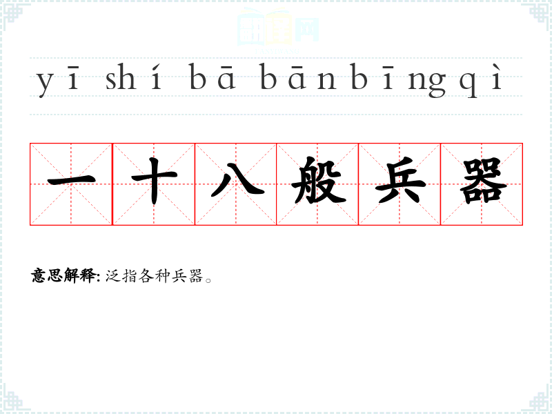 | 十八般兵器 | 本指刀枪剑戟等十八种古式兵器。后泛指多种武器。亦比喻多种技能。 |