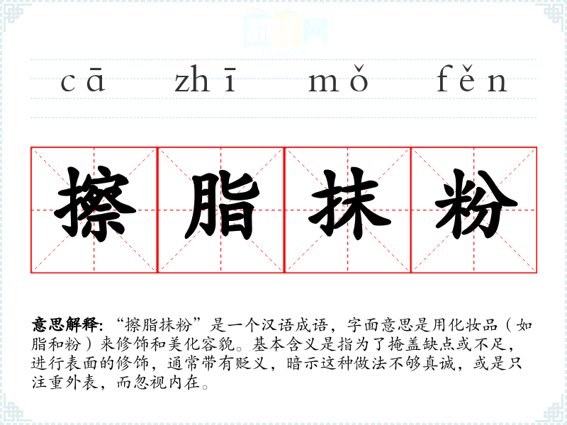 “擦脂抹粉”是一个汉语成语,字面意思是用化妆品(如脂和粉)来修饰和美化容貌。基本含义是指为了掩盖缺点或不足,进行表面的修饰,通常带有贬义,暗示这种做法不够真诚,或是只注重外表,而忽视内在。