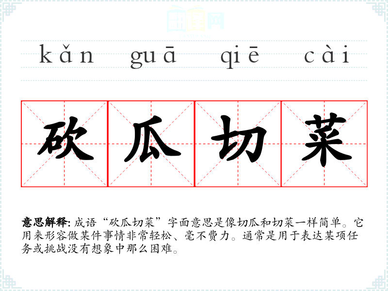 成语“砍瓜切菜”字面意思是像切瓜和切菜一样简单。它用来形容做某件事情非常轻松、毫不费力。通常是用于表达某项任务或挑战没有想象中那么困难。