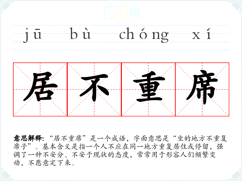 “居不重席”是一个成语,字面意思是“坐的地方不重复席子”。基本含义是指一个人不应在同一地方重复居住或停留,强调了一种不安分、不安于现状的态度,常常用于形容人们频繁变动,不愿意定下来。