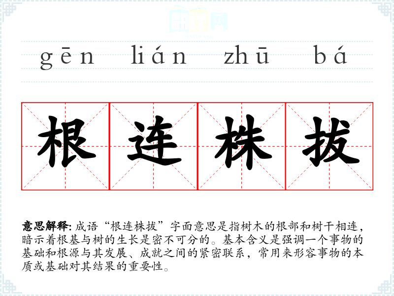 成语“根连株拔”字面意思是指树木的根部和树干相连,暗示着根基与树的生长是密不可分的。基本含义是强调一个事物的基础和根源与其发展、成就之间的紧密联系,常用来形容事物的本质或基础对其结果的重要性。