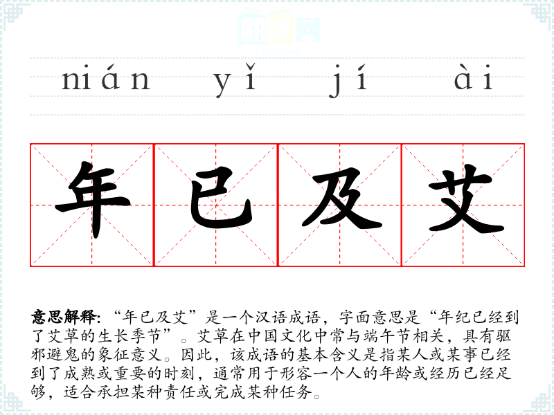 | 年已及艾 | 艾:代指五十岁。老年头发花白如艾。指已到老年。 |
