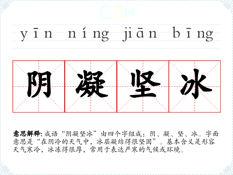 成语“阴凝坚冰”由四个字组成:阴、凝、坚、冰。字面意思是“在阴冷的天气中,冰层凝结得很坚固”。基本含义是形容天气寒冷,冰冻得很厚,常用于表达严寒的气候或环境。