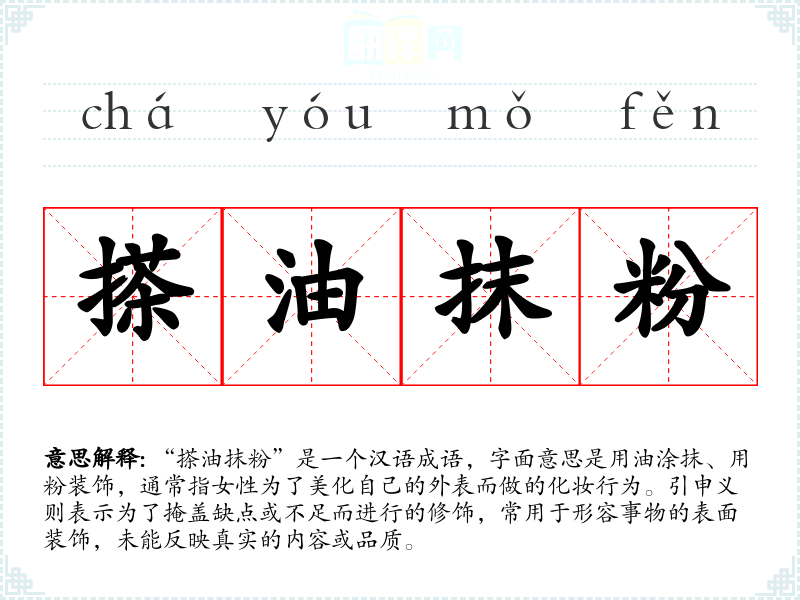 “搽油抹粉”是一个汉语成语,字面意思是用油涂抹、用粉装饰,通常指女性为了美化自己的外表而做的化妆行为。引申义则表示为了掩盖缺点或不足而进行的修饰,常用于形容事物的表面装饰,未能反映真实的内容或品质。
