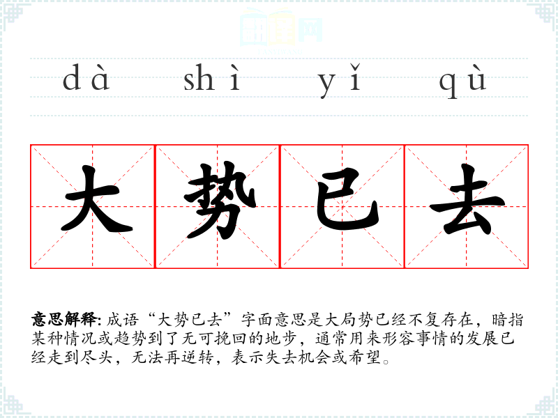 成语“****”字面意思是大局势已经不复存在,暗指某种情况或趋势到了无可挽回的地步,通常用来形容事情的发展已经走到尽头,无法再逆转,表示失去机会或希望。