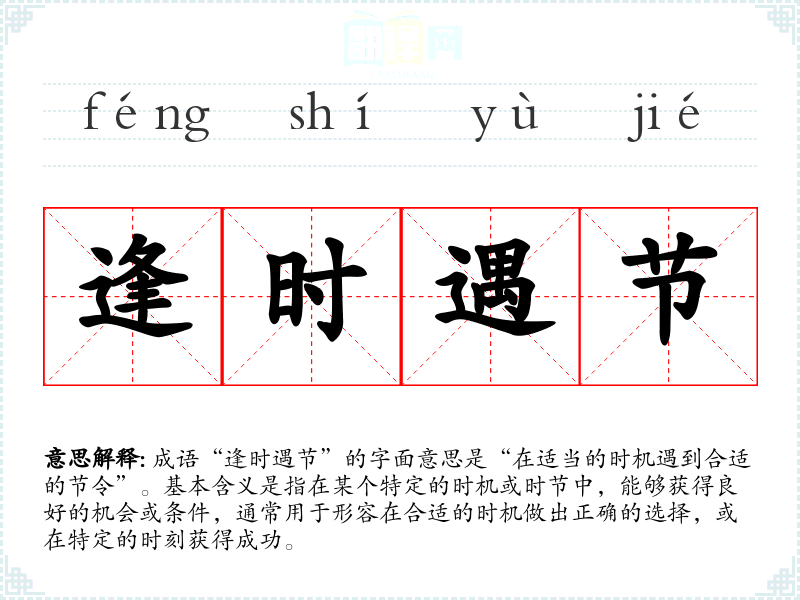 成语“逢时遇节”的字面意思是“在适当的时机遇到合适的节令”。基本含义是指在某个特定的时机或时节中,能够获得良好的机会或条件,通常用于形容在合适的时机做出正确的选择,或在特定的时刻获得成功。