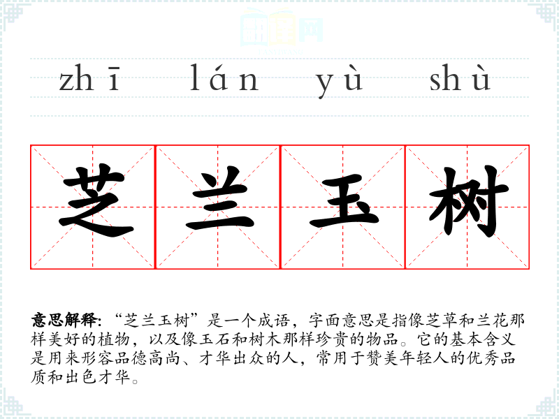 “芝兰玉树”给人一种美好、高尚的联想,代表着对优秀品德和才华的向往与追求。它激励人们努力提升自我,追求卓越。