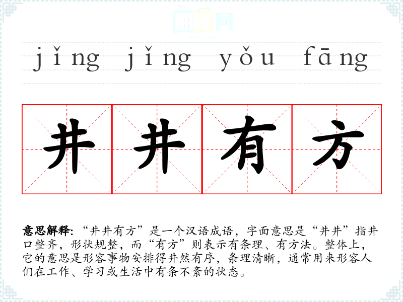 “井井有方”是一个汉语成语,字面意思是“井井”指井口整齐,形状规整,而“有方”则表示有条理、有方法。整体上,它的意思是形容事物安排得井然有序,条理清晰,通常用来形容人们在工作、学习或生活中有条不紊的状态。