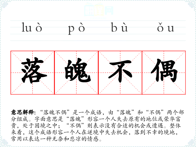 “落魄不偶”是一个成语,由“落魄”和“不偶”两个部分组成。字面意思是“落魄”形容一个人失去原有的地位或荣华富贵,处于困境之中;“不偶”则表示没有合适的机会或遭遇。整体来看,这个成语形容一个人在逆境中失去机会,落到不幸的境地,常用以表达一种无奈和悲凉的情感。