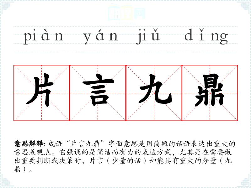 成语“片言九鼎”字面意思是用简短的话语表达出重大的意思或观点。它强调的是简洁而有力的表达方式,尤其是在需要做出重要判断或决策时,片言(少量的话)却能具有重大的分量(九鼎)。