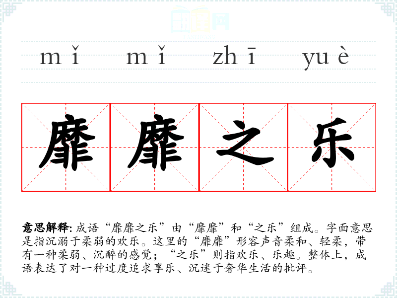 成语“靡靡之乐”由“靡靡”和“之乐”组成。字面意思是指沉溺于柔弱的欢乐。这里的“靡靡”形容声音柔和、轻柔,带有一种柔弱、沉醉的感觉;“之乐”则指欢乐、乐趣。整体上,成语表达了对一种过度追求享乐、沉迷于奢华生活的批评。