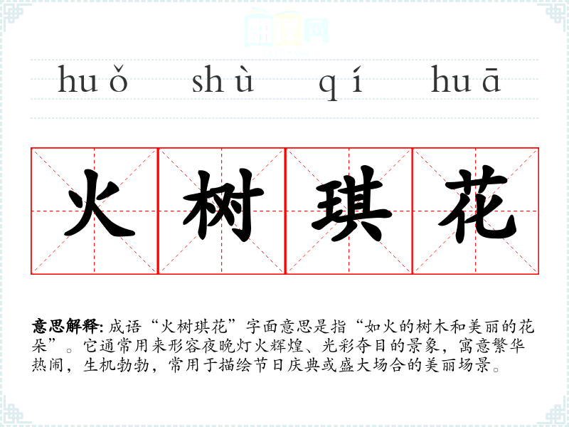 成语“火树琪花”字面意思是指“如火的树木和美丽的花朵”。它通常用来形容夜晚灯火辉煌、光彩夺目的景象,寓意繁华热闹,生机勃勃,常用于描绘节日庆典或盛大场合的美丽场景。