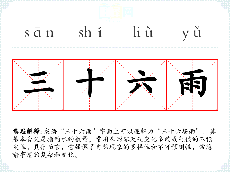 成语“三十六雨”字面上可以理解为“三十六场雨”。其基本含义是指雨水的数量,常用来形容天气变化多端或气候的不稳定性。具体而言,它强调了自然现象的多样性和不可预测性,常隐喻事情的复杂和变化。