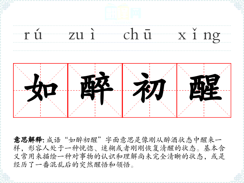 “如醉初醒”给人一种从混沌到清晰的转变感,反映了人们在生活中常经历的迷茫与顿悟的情感。它也激发了对自我反思的联想,促使人们在困扰中寻求真理。
