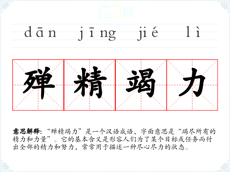 “殚精竭力”是一个汉语成语,字面意思是“竭尽所有的精力和力量”。它的基本含义是形容人们为了某个目标或任务而付出全部的精力和努力,常常用于描述一种尽心尽力的状态。