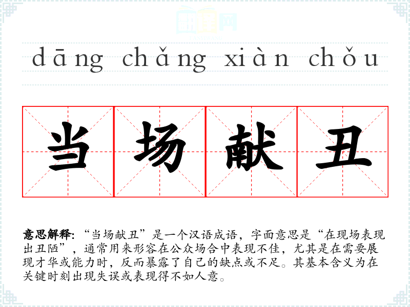 “当场献丑”并没有明确的历史典故,但其构成可以拆分为“当场”(现场)和“献丑”(表现丑陋)。这两个词反映了在某个特定场合中,由于紧张、缺乏准备或其他原因,导致表现失误的情形。成语可能源于古代文人雅士在聚会、宴席等社交场合中,若在即兴表演时出现失误,便会被称为“献丑”。