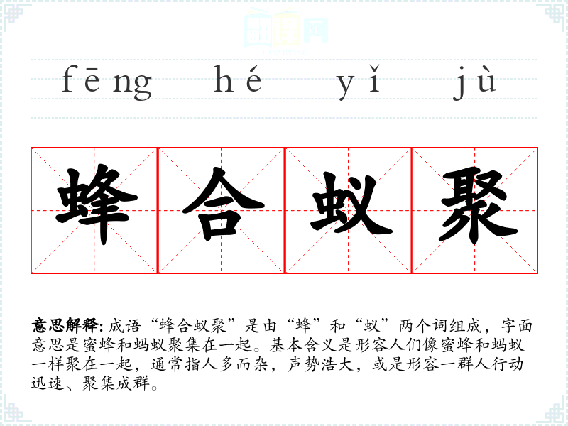 成语“蜂合蚁聚”是由“蜂”和“蚁”两个词组成,字面意思是蜜蜂和蚂蚁聚集在一起。基本含义是形容人们像蜜蜂和蚂蚁一样聚在一起,通常指人多而杂,声势浩大,或是形容一群人行动迅速、聚集成群。