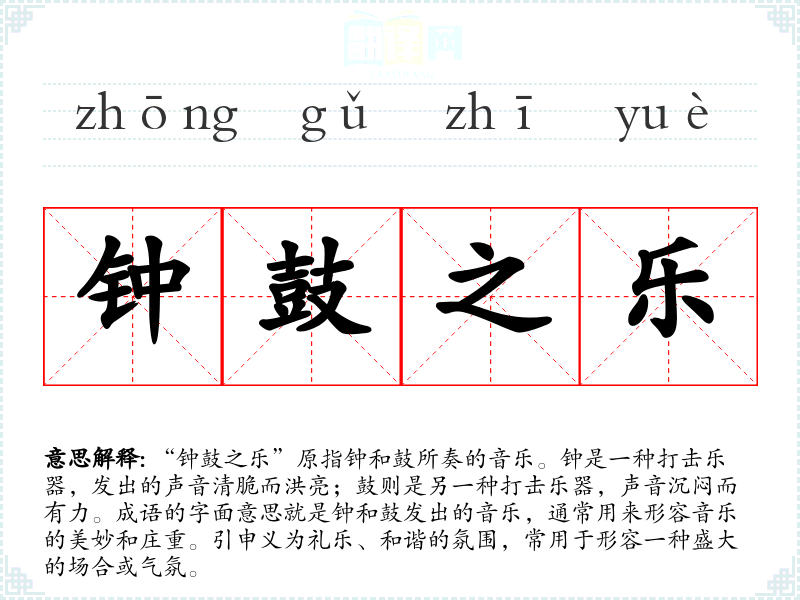 “钟鼓之乐”原指钟和鼓所奏的音乐。钟是一种打击乐器,发出的声音清脆而洪亮;鼓则是另一种打击乐器,声音沉闷而有力。成语的字面意思就是钟和鼓发出的音乐,通常用来形容音乐的美妙和庄重。引申义为礼乐、和谐的氛围,常用于形容一种盛大的场合或气氛。