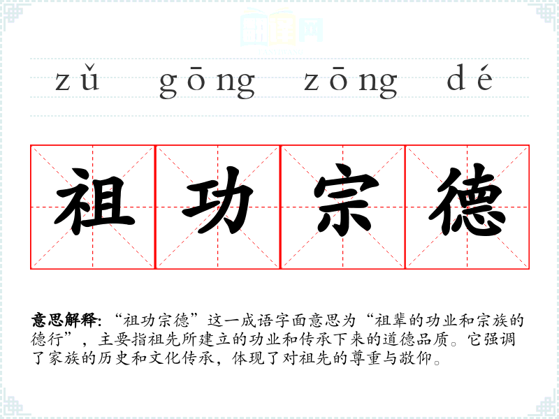 “祖功宗德”这一成语字面意思为“祖辈的功业和宗族的德行”,主要指祖先所建立的功业和传承下来的道德品质。它强调了家族的历史和文化传承,体现了对祖先的尊重与敬仰。