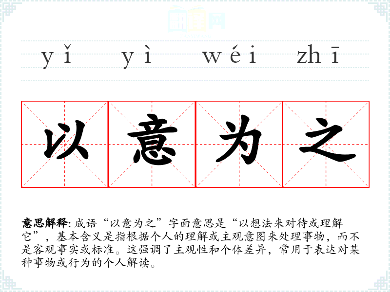 成语“以意为之”字面意思是“以想法来对待或理解它”,基本含义是指根据个人的理解或主观意图来处理事物,而不是客观事实或标准。这强调了主观性和个体差异,常用于表达对某种事物或行为的个人解读。