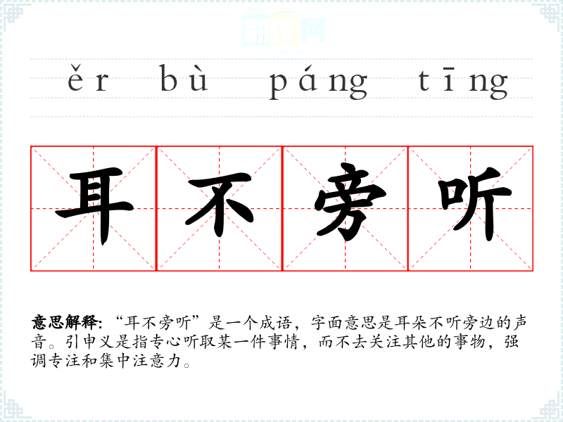 “耳不旁听”是一个成语,字面意思是耳朵不听旁边的声音。引申义是指专心听取某一件事情,而不去关注其他的事物,强调专注和集中注意力。