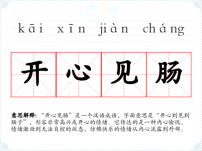 “开心见肠”是一个汉语成语,字面意思是“开心到见到肠子”,形容非常高兴或开心的情绪。它传达的是一种内心愉悦、情绪激动到无法自控的状态,仿佛快乐的情绪从内心流露到外部。