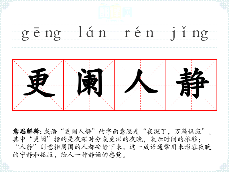 成语“更阑人静”的字面意思是“夜深了,万籁俱寂”。其中“更阑”指的是夜深时分或更深的夜晚,表示时间的推移;“人静”则意指周围的人都安静下来。这一成语通常用来形容夜晚的宁静和孤寂,给人一种静谧的感觉。