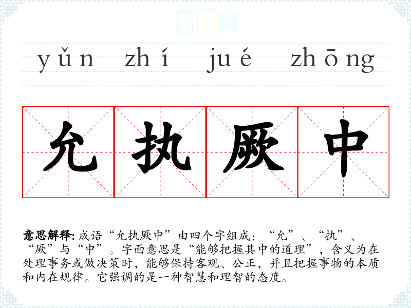 成语“允执厥中”由四个字组成:“允”、“执”、“厥”与“中”。字面意思是“能够把握其中的道理”,含义为在处理事务或做决策时,能够保持客观、公正,并且把握事物的本质和内在规律。它强调的是一种智慧和理智的态度。