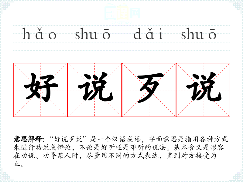 “好说歹说”是一个汉语成语,字面意思是指用各种方式来进行劝说或辩论,不论是好听还是难听的说法。基本含义是形容在劝说、劝导某人时,尽量用不同的方式表达,直到对方接受为止。