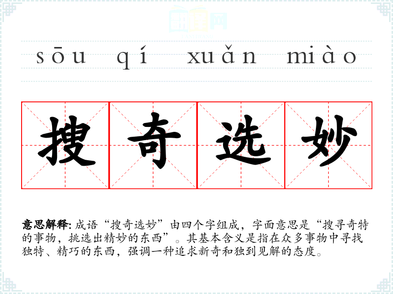 成语“搜奇选妙”由四个字组成,字面意思是“搜寻奇特的事物,挑选出精妙的东西”。其基本含义是指在众多事物中寻找独特、精巧的东西,强调一种追求新奇和独到见解的态度。