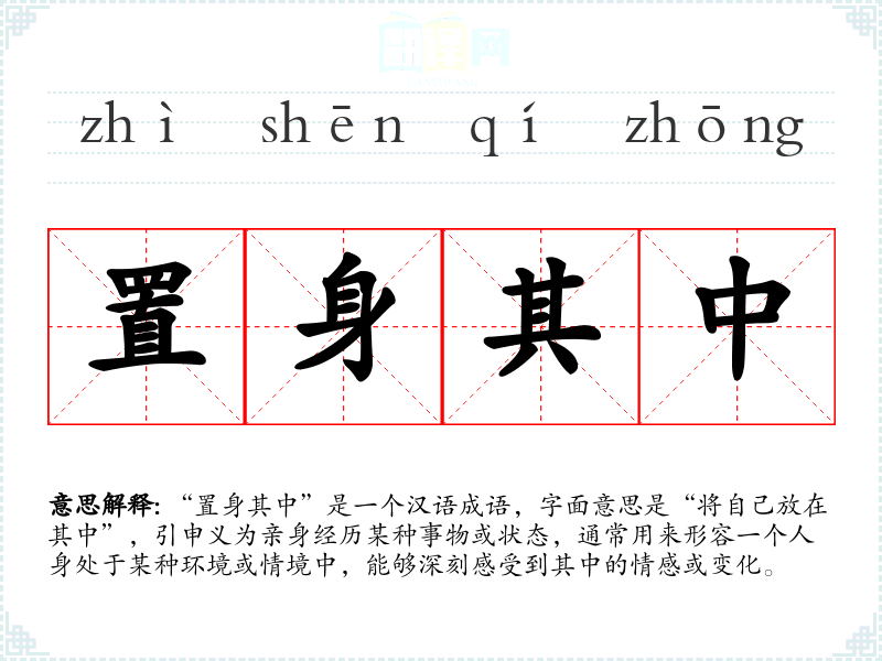 “置身其中”是一个汉语成语,字面意思是“将自己放在其中”,引申义为亲身经历某种事物或状态,通常用来形容一个人身处于某种环境或情境中,能够深刻感受到其中的情感或变化。