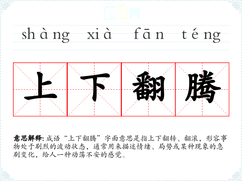“上下翻腾”让人联想到不安、焦虑和紧张。它能够引发对生活变化的反思,也可能唤起对过去不稳定时期的回忆。在表达情感时,这一成语能够有效地传达出一种波动的感受。