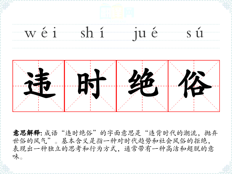成语“违时绝俗”的字面意思是“违背时代的潮流,抛弃世俗的风气”。基本含义是指一种对时代趋势和社会风俗的拒绝,表现出一种独立的思考和行为方式,通常带有一种高洁和超脱的意味。