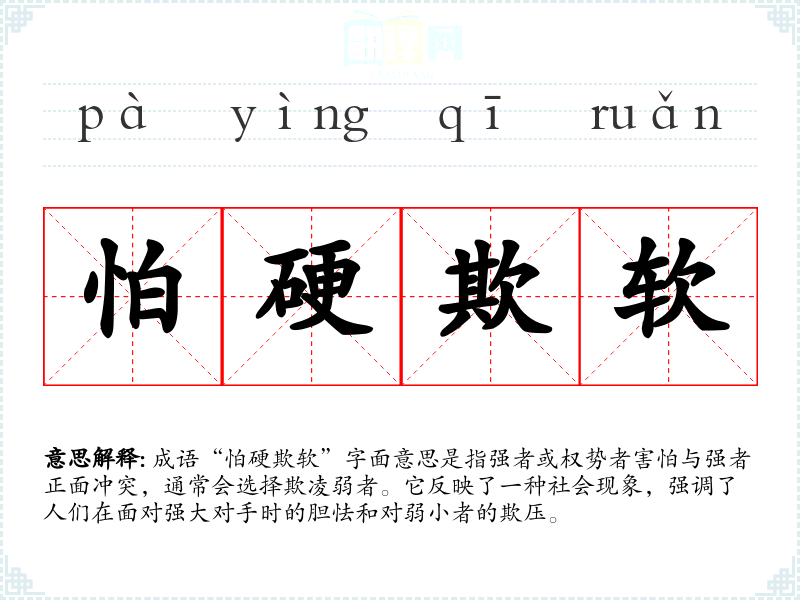 成语“怕硬欺软”字面意思是指强者或权势者害怕与强者正面冲突,通常会选择欺凌弱者。它反映了一种社会现象,强调了人们在面对强大对手时的胆怯和对弱小者的欺压。