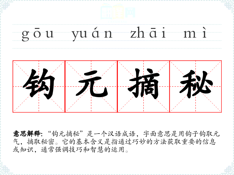 “钩元摘秘”是一个汉语成语,字面意思是用钩子钩取元气,摘取秘密。它的基本含义是指通过巧妙的方法获取重要的信息或知识,通常强调技巧和智慧的运用。