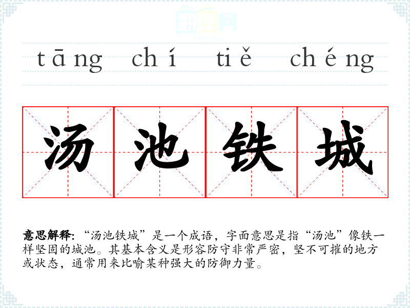 “汤池铁城”并没有明确的历史典故或文献出处,但可以推测其来源于古代对于坚固城防的描述。古代的城池如果能够抵挡住敌人的攻击,就如同“铁城”一般结实。而“汤池”则可能隐喻某种热情或热烈的状态,结合在一起,形成了对于坚固防御的夸张表达。
