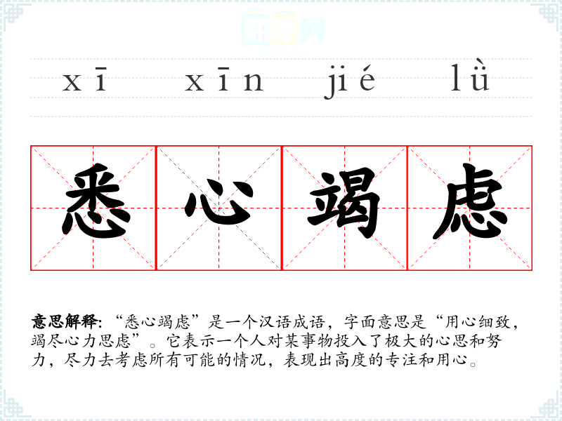 “悉心竭虑”是一个汉语成语,字面意思是“用心细致,竭尽心力思虑”。它表示一个人对某事物投入了极大的心思和努力,尽力去考虑所有可能的情况,表现出高度的专注和用心。