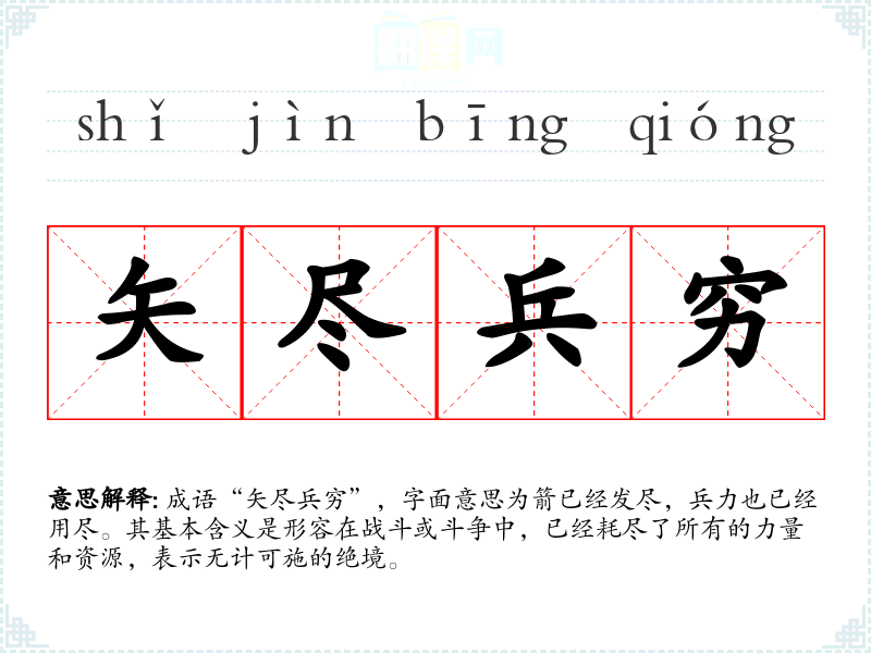 成语“矢尽兵穷”,字面意思为箭已经发尽,兵力也已经用尽。其基本含义是形容在战斗或斗争中,已经耗尽了所有的力量和资源,表示无计可施的绝境。