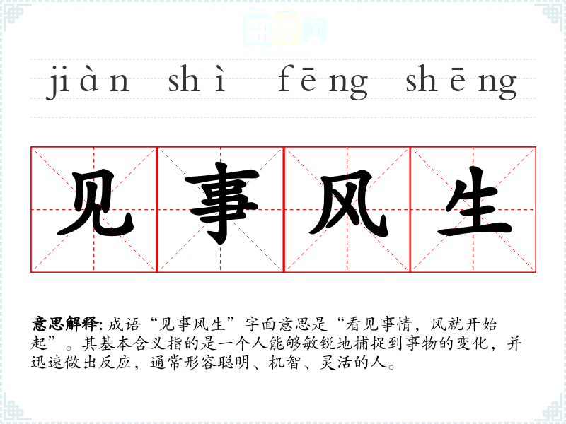 成语“见事风生”字面意思是“看见事情,风就开始起”。其基本含义指的是一个人能够敏锐地捕捉到事物的变化,并迅速做出反应,通常形容聪明、机智、灵活的人。