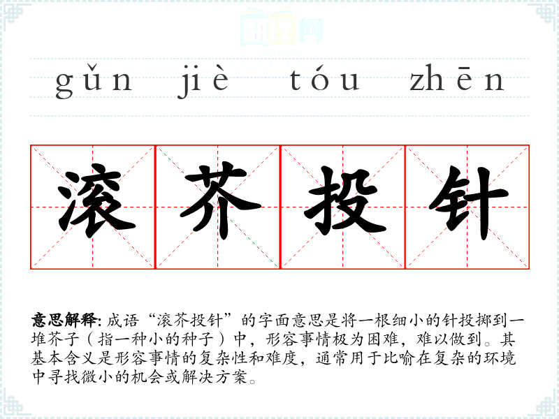 成语“滚芥投针”的字面意思是将一根细小的针投掷到一堆芥子(指一种小的种子)中,形容事情极为困难,难以做到。其基本含义是形容事情的复杂性和难度,通常用于比喻在复杂的环境中寻找微小的机会或解决方案。
