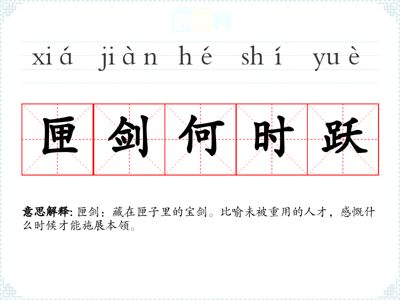 | 匣剑何时跃 | 匣剑:藏在匣子里的宝剑。比喻未被重用的人才,感慨什么时候才能施展本领。 |