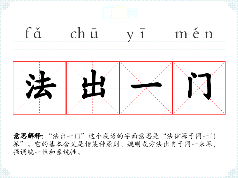 “法出一门”这个成语的字面意思是“法律源于同一门派”。它的基本含义是指某种原则、规则或方法出自于同一来源,强调统一性和系统性。