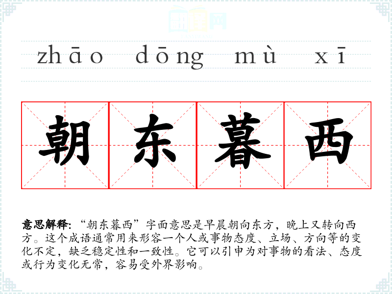 “朝东暮西”字面意思是早晨朝向东方,晚上又转向西方。这个成语通常用来形容一个人或事物态度、立场、方向等的变化不定,缺乏稳定性和一致性。它可以引申为对事物的看法、态度或行为变化无常,容易受外界影响。