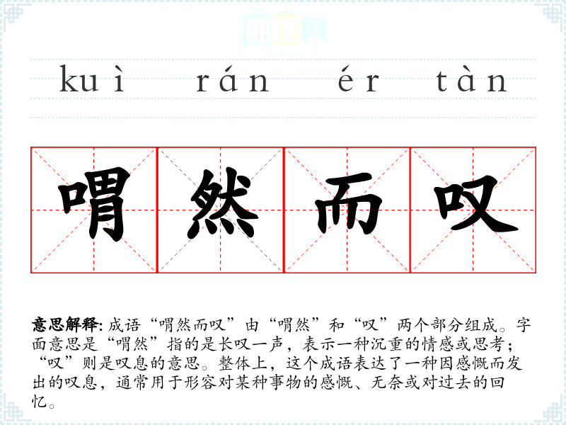 成语“喟然而叹”由“喟然”和“叹”两个部分组成。字面意思是“喟然”指的是长叹一声,表示一种沉重的情感或思考;“叹”则是叹息的意思。整体上,这个成语表达了一种因感慨而发出的叹息,通常用于形容对某种事物的感慨、无奈或对过去的回忆。